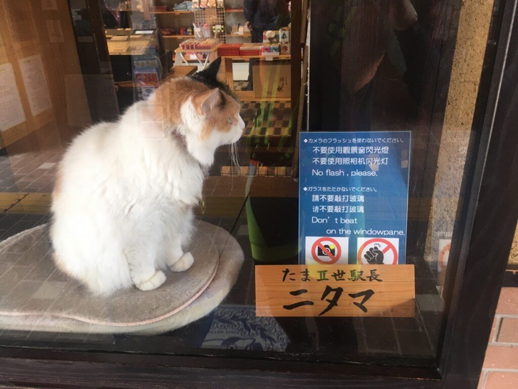 ニタマ駅長、お仕事中。「ニャンニャン♪」と言って喜ぶ子ども。ニタマは落ち着いていて大人の対応。
