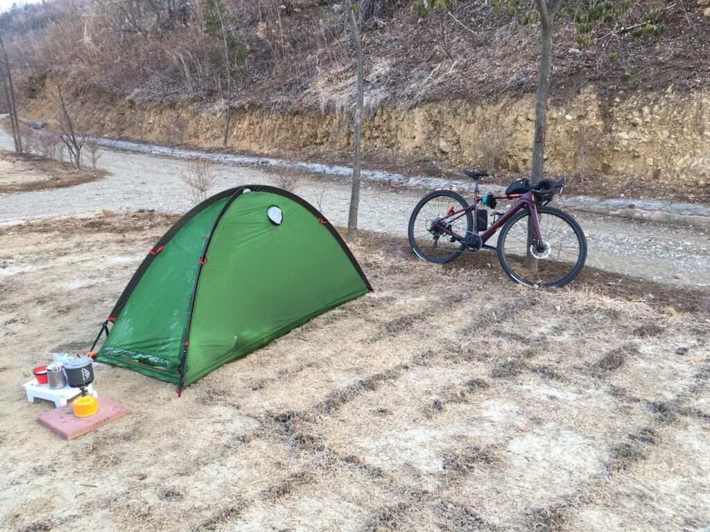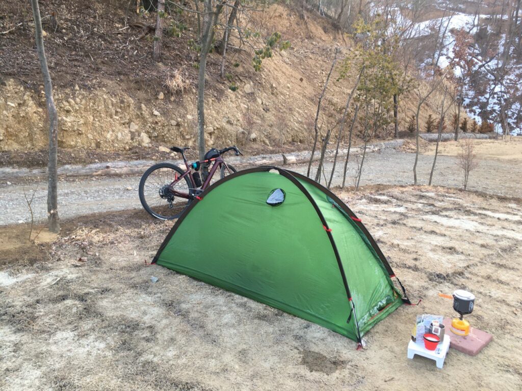 2泊3日の旅程で、1日目は松本市まで輪行で行ってキャンプ場に1泊、翌朝目的地を目指す計画。松本市は私の住む大阪と比べて冬は5℃ほど気温が低く、最低気温は氷点下が当たり前、雪はあまり降らないという印象だったが、私が行った日は2月としては温暖で、ほぼ普通の冬キャンプになった。