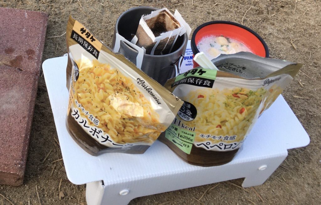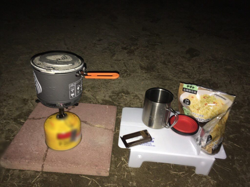 テントのフロアにアルミブランケットを敷いて座り、そこからお湯を沸かして食事をする。テーブルも持ってきていたが、せっかくなので借りたタイルも使ってみる。いつものサタケのパスタを2食分、乾燥野菜を入れて食べ、コーヒーを飲んでゆっくりする。銭湯に行くことも考えていたが、最後の登りが結構しんどかったので往復する気が失せて、テント内で身づくろいすることにした。