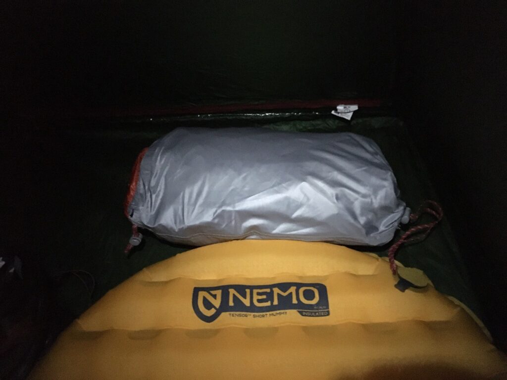 寝袋のスタッフバッグに着替えをつめてマットの下に入れて枕代わりに。