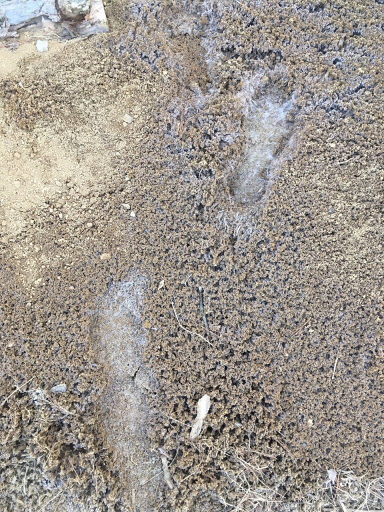 夜に歩いた足跡に霜柱ができていて、おもしろい形になっている。キノコの菌糸のようだ。