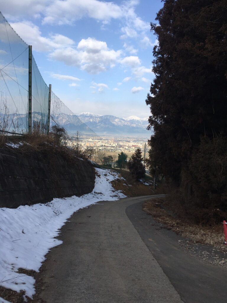 里山という名前の通り、普通の道だったのが急にここだけ高くなる。400mで45m登るので平均勾配は11%。足付きなしで受付まで登れたけれど、ものすごくハァハァする。後から調べたところ、塩尻の標高は700mちょっとで、普段高くても100mくらいで生活しているから体がついていかなかったのではないか、と思っている。