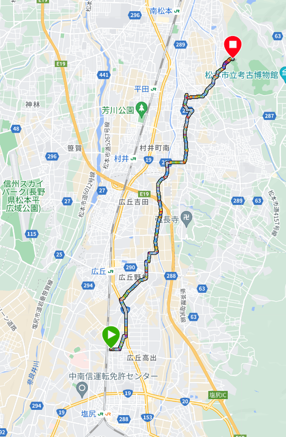 当初は塩尻駅で乗り換えて南松本駅からキャンプ場に行く予定だったが、待ち時間と移動時間を考慮すると塩尻から12kmほど自走するほうが速いように思えた。