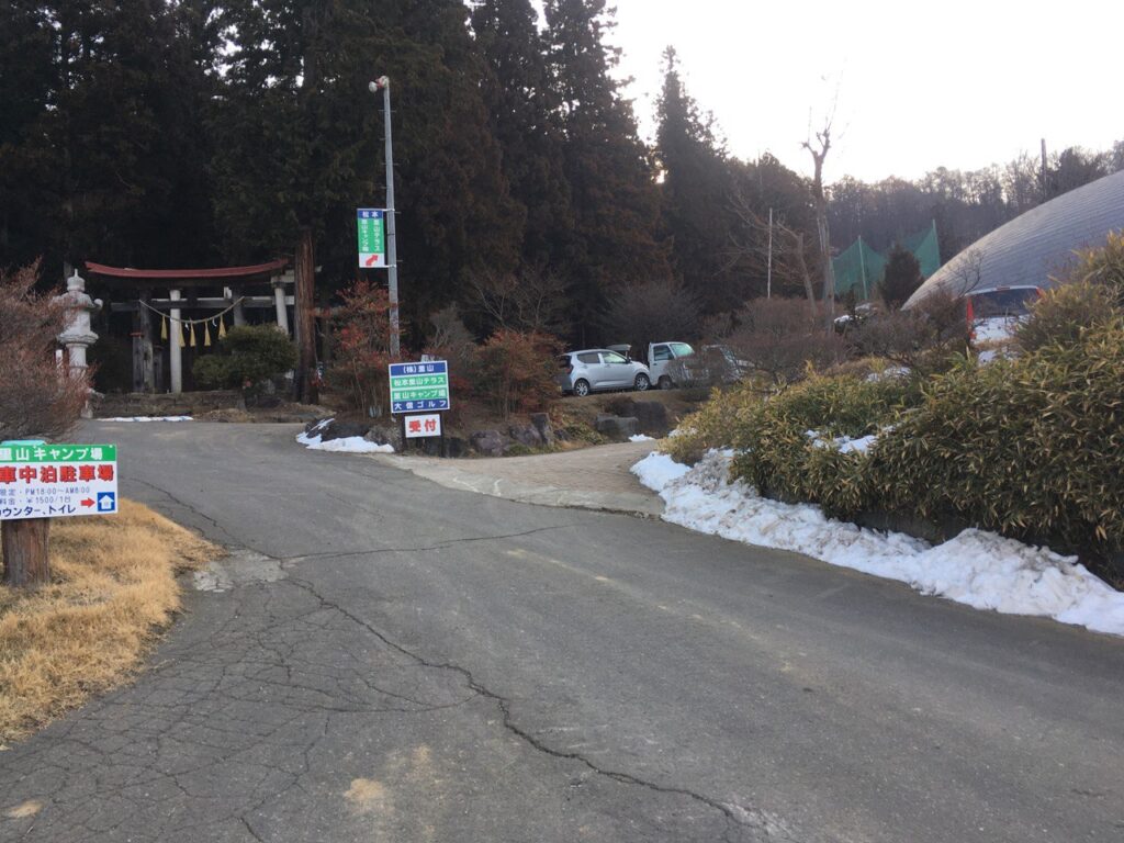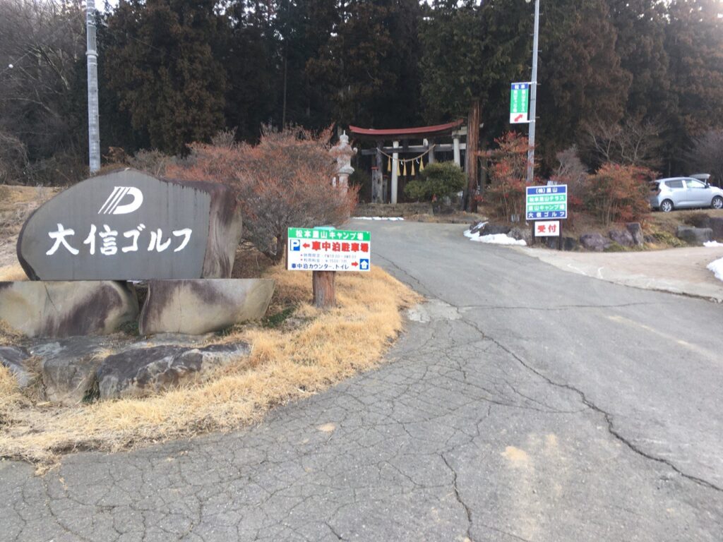 大信ゴルフ場の駐車場を左手に見て、その右手に受付の建物がある。駐車場では車中泊のみもできるらしい。受付はゴルフ場と共通とのこと。遅れたことをお詫びし、宿帳のように紙に記入して受付。場内の案内図をいただいて、場所は「ついてきて」と軽トラで案内していただいた。が、
