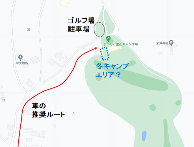 このあたりで冬も営業しているキャンプ場は少なく、まつもと里山キャンプ場は市街地にも近い貴重な通年キャンプ場。詳細は以下の通り(ただし、受付でいただいた場内マップを紛失したため記憶頼り)。