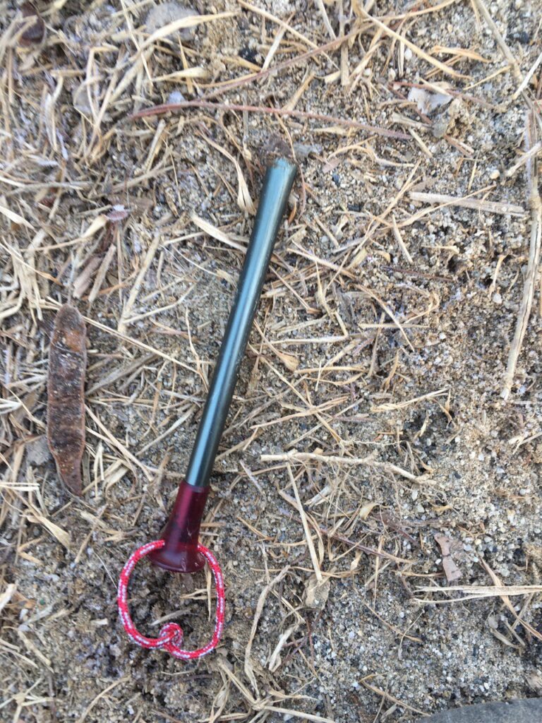 私も含め4組ほどテントがあり、立地の良さと人気を感じた。皆ソロだったのかとても静かだった。日が落ちる中、クロスオーバードームfを設営。ここでグランドシートを持って来ていないことに気づくorz 芝なのでフロアが傷つかなくて助かった。風はほとんど吹いていなかったが、一応4隅にペグを打つことにして、MSRカーボンコアステイクを石で打ちこむ。しかし、芝の根が絡んでいるからなのかなかなか入らない。踏み込んで入れようとしたら折れたorz