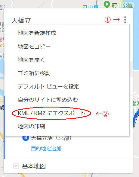 ①のマークをクリック → ②KML/KMZにエクスポート でKMLファイルにエクスポートしてダウンロード。