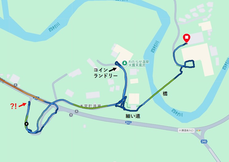 この分岐からうまく道沿いに進むと、というか進み過ぎると、わたらせ温泉大露天風呂前に出ます。この前に町内唯一のコインランドリーがあります。ちなみに、”渡瀬”温泉の読み自体は”わたぜ”のようですが、ここに”わたらせ”温泉という施設があるため、どちらで検索しても出てきます。