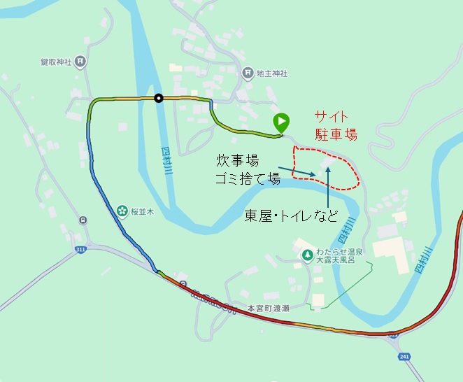 キャンプサイトと帰り道です。来た道との縮尺の違いにご注意。