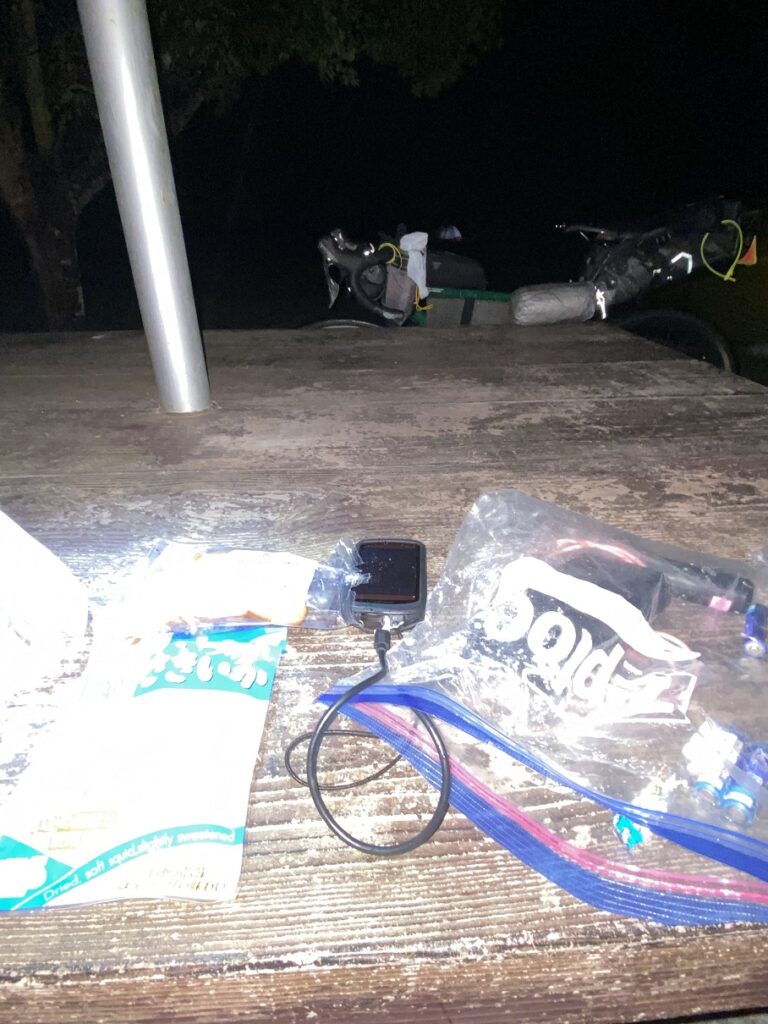 大雨でもう人の出入りはほぼなかったので、東屋に自転車を置いて軽食を食べながら荷物を整理しました。「荒天時一時避難場所」となっている横の所です。だいぶ助かりました。