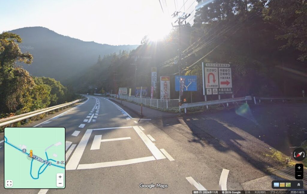 訪れたのは10月初旬、激しく雨の降る夜。国道311号線を西から来て、右折で下っていくのですが、本来曲がるはずの所を通り過ぎた上に、Googleマップで現在地がうまく拾えず迷ってしまいました。