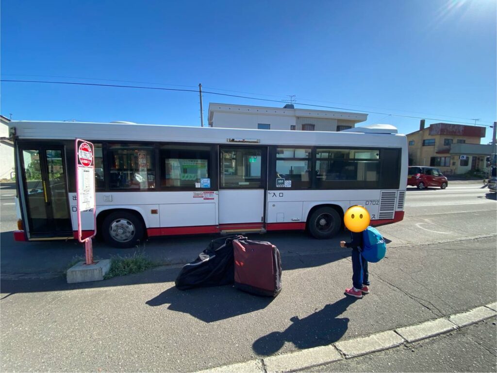 ここで路線バスに乗り換えます。目指すキャンプ場はCAMP VILLAGE ピュットの森、帯広市の隣の河東郡音更町(おとふけちょう)然別(しかりべつ)にあります。最寄りと呼べるバス停は2ヶ所ありますが、今回は拓殖バスの西17条北1丁目から自走で向かうことにしました。バスは平日昼間のためか空いていて、ブロンプトンと子供自転車を載せても邪魔になりませんでした。