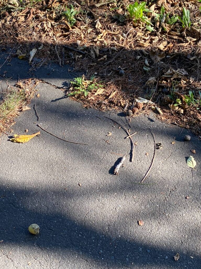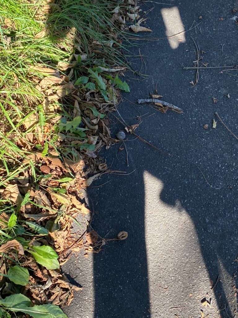 多分街路樹から落ちたくるみ。くるみが特段珍しくもなく見つかるのが北海道らしいですね。ゆっくりだから目に留まる物もあります。