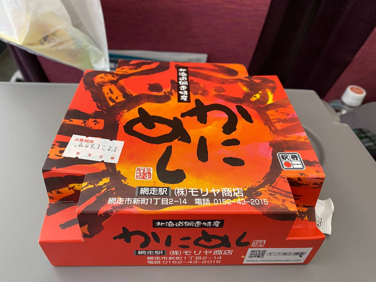 私たちが乗る大雪が来ました。ホームでかにめしときのこの山を買って乗ります。かにめしは幸い子どもが欲しがらなかったので独り占めできました。