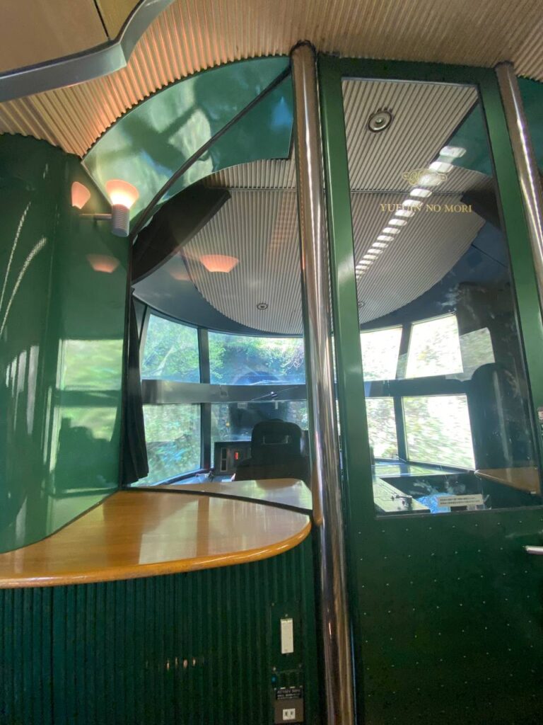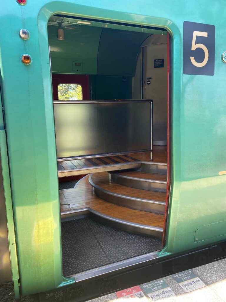 デッキはこういう階段になっているので、待ち時間の間にあらかじめトレーラーは畳んでおきました。ゆふいんの森では、車内の座席をいくつか荷物置き場のためにつぶしていて、乗務員さんが手際よく積んでいっていました。私の乗った車両は女性の乗務員さんで、結構な数と重量をテキパキとこなしておられました。あの荷物の量を見ると、新幹線の特大荷物スペースって全く足りていないなと改めて思います。