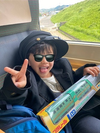 車内販売ではドーナツとプラレールを買いました。乗客サービスにキャンディーをいただいたほか、子どもには乗務員なりきりのジャケットと帽子のセットを貸してもらうことができ、記念撮影もできました。ご機嫌も治ったようです。